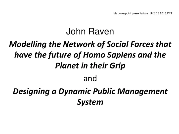 My powerpoint presentations: UKSDS 2018.PPT John Raven Modelling the Network of Social Forces that have the future of Homo Sapiens and the Planet in their Grip and Designing a Dynamic Public Management System