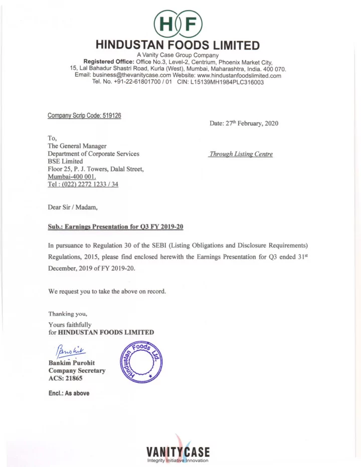 / ~ @£) HINDUSTAN FOODS LIMITED A Vanity Case Group Company Registered Office: Office No.3, Level-2, Centrium, Phoenix Market Ci ty, 15, Lal Bahadur Shastri Road, Kurla (West ), Mumbai, Maharashtra, India. 400 070. Emai l: business@thevanitycase.com Website: www.hindustanfoodslimited.com Tel. No. +91-22-61801700 I 01 CIN: L 15139MH1984PLC316003 Company Scrip Code: 519126 Date: 2?ili February, 2020 To, The General Manager Department of Corporate Services Through Listing Centre BSE Limited Floor 25, P. J. Towers, Dalal Street, Mumbai-400 001. Tel : (022) 2272 1233 I 34 Dear Sir I Madam, Sub.: Earnings Presentation for 03 FY 2019-20 In pursuance to Regulation 30 of the SEBI (Listing Obligations and Disclosure Requirements) Regulations, 2015, please find enclosed herewith the Earnings Presentation for Q3 ended 3P 1 December, 2019 ofFY 2019-20. We request you to take the above on record. Thanking you, Yours faithfully for HINDUSTAN FOODS LIMITED aA ~v Bankim Purohit Company Secretary ACS: 21865 Encl.: As above VANITY CASE Inte gr ity Initi at ive Innovation