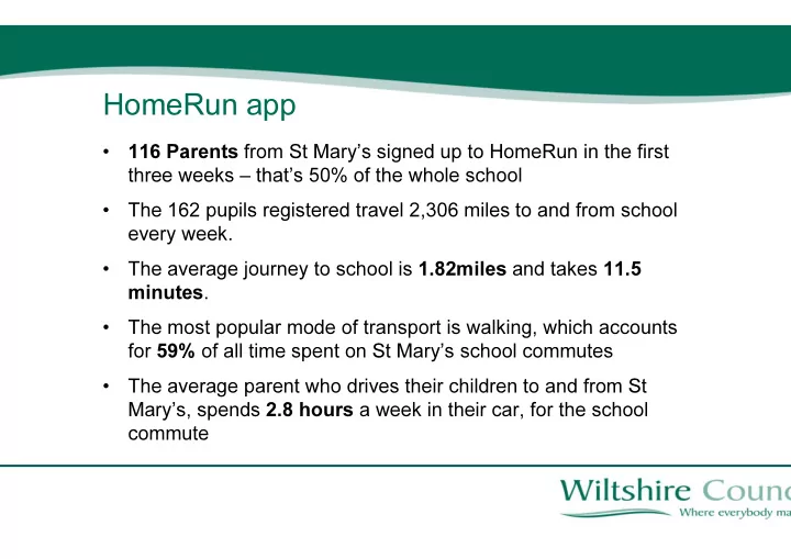 HomeRun app • 116 Parents from St Mary’s signed up to HomeRun in the first three weeks – that’s 50% of the whole school • The 162 pupils registered travel 2,306 miles to and from school every week. • The average journey to school is 1.82miles and takes 11.5 minutes . • The most popular mode of transport is walking, which accounts for 59% of all time spent on St Mary’s school commutes • The average parent who drives their children to and from St Mary’s, spends 2.8 hours a week in their car, for the school commute