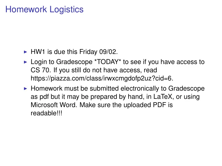 Homework Logistics ◮ HW1 is due this Friday 09/02. ◮ Login to Gradescope *TODAY* to see if you have access to CS 70. If you still do not have access, read https://piazza.com/class/irwxcmgdofp2uz?cid=6. ◮ Homework must be submitted electronically to Gradescope as pdf but it may be prepared by hand, in LaTeX, or using Microsoft Word. Make sure the uploaded PDF is readable!!!