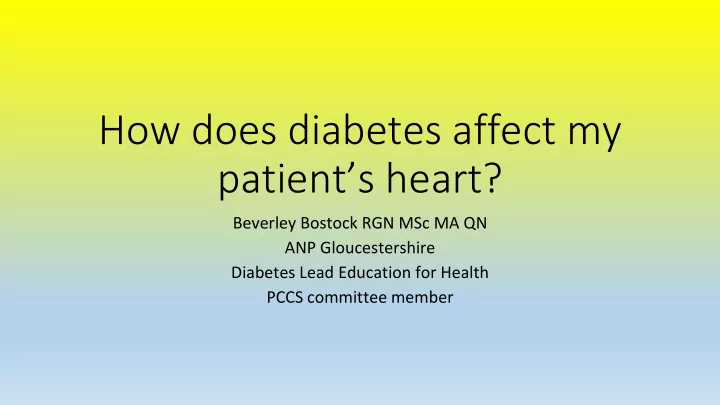 How does diabetes affect my patient’s heart? Beverley Bostock RGN MSc MA QN ANP Gloucestershire Diabetes Lead Education for Health PCCS committee member