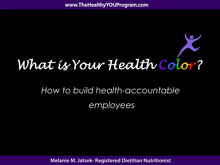 www.T .TheHealth heHealthyY yYOUP OUProg ogram.c am.com om What is Yo Your r Hea ealth Color? ? How to build health-accountable employees ¡ ¡ Melanie M. Jatsek- Registered Dietitian Nutritionist