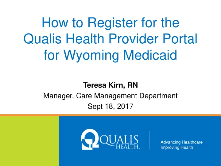 How to Register for the Qualis Health Provider Portal for Wyoming Medicaid Teresa Kirn, RN Manager, Care Management Department Sept 18, 2017 Advancing Healthcare Improving Health