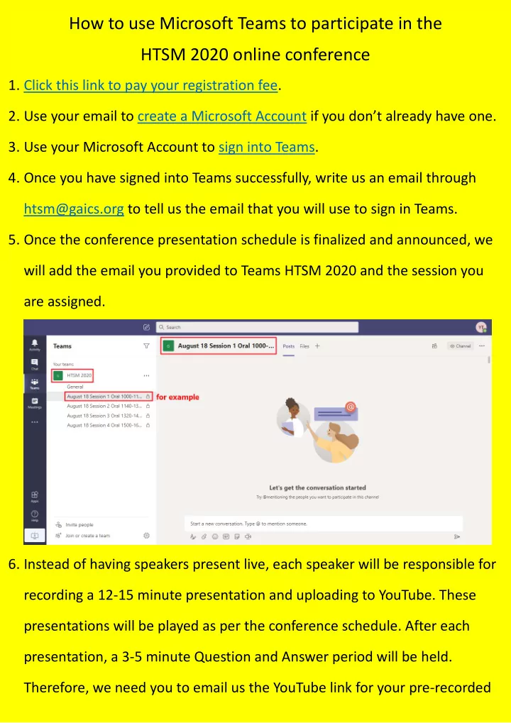 How to use Microsoft Teams to participate in the HTSM 2020 online conference 1. Click this link to pay your registration fee. 2. Use your email to create a Microsoft Account if you don’t already have one. 3. Use your Microsoft Account to sign into Teams. 4. Once you have signed into Teams successfully, write us an email through htsm@gaics.org to tell us the email that you will use to sign in Teams. 5. Once the conference presentation schedule is finalized and announced, we will add the email you provided to Teams HTSM 2020 and the session you are assigned. 6. Instead of having speakers present live, each speaker will be responsible for recording a 12-15 minute presentation and uploading to YouTube. These presentations will be played as per the conference schedule. After each presentation, a 3-5 minute Question and Answer period will be held. Therefore, we need you to email us the YouTube link for your pre-recorded
