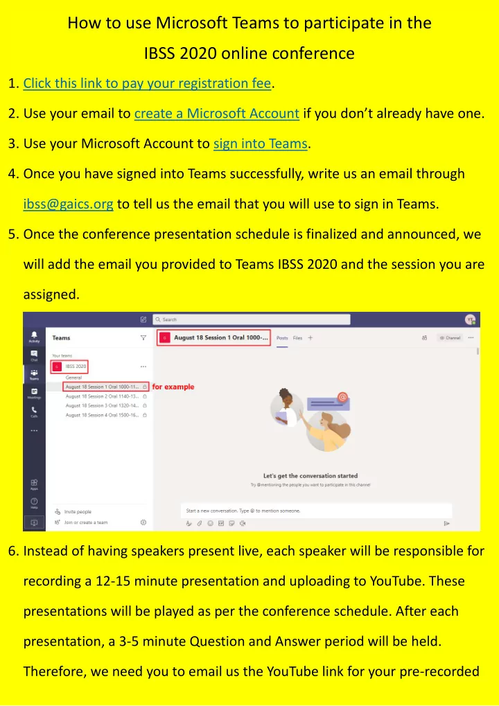 How to use Microsoft Teams to participate in the IBSS 2020 online conference 1. Click this link to pay your registration fee. 2. Use your email to create a Microsoft Account if you don’t already have one. 3. Use your Microsoft Account to sign into Teams. 4. Once you have signed into Teams successfully, write us an email through ibss@gaics.org to tell us the email that you will use to sign in Teams. 5. Once the conference presentation schedule is finalized and announced, we will add the email you provided to Teams IBSS 2020 and the session you are assigned. 6. Instead of having speakers present live, each speaker will be responsible for recording a 12-15 minute presentation and uploading to YouTube. These presentations will be played as per the conference schedule. After each presentation, a 3-5 minute Question and Answer period will be held. Therefore, we need you to email us the YouTube link for your pre-recorded
