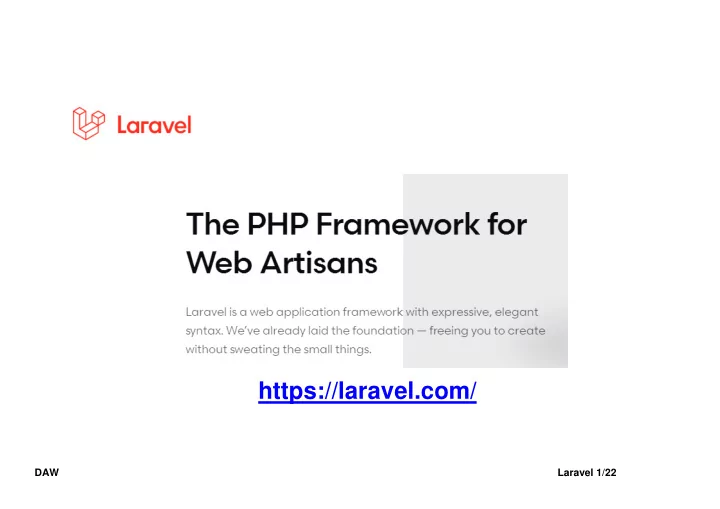 The controller class … • The general syntax for calling the controller is http://www. domain.com/index.php/controller/method/arg • If rewriting base is active in .htaccess http://www. domain.com/controller/method/arg DAW Laravel 9/22
