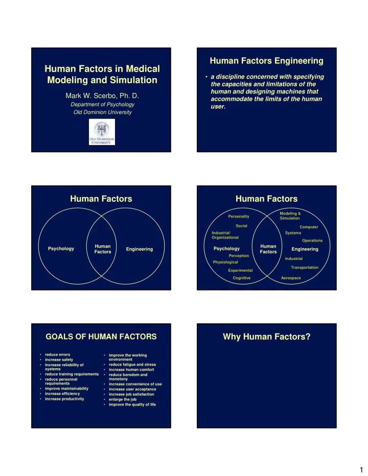 Human Factors Engineering Human Factors in Medical • a discipline concerned with specifying Modeling and Simulation the capacities and limitations of the human and designing machines that Mark W. Scerbo, Ph. D. accommodate the limits of the human Department of Psychology user. Old Dominion University Human Factors Human Factors Modeling & Personality Simulation Social Computer Industrial/ Systems Organizational Operations Human Human Psychology Psychology Engineering Engineering Factors Factors Perception Industrial Physiological Transportation Experimental Cognitive Aerospace Why Human Factors? GOALS OF HUMAN FACTORS • reduce errors • improve the working environment • increase safety • reduce fatigue and stress • increase reliability of systems • increase human comfort • reduce training requirements • reduce boredom and monotony • reduce personnel requirements • increase convenience of use • improve maintainability • increase user acceptance • increase efficiency • increase job satisfaction • increase productivity • enlarge the job • improve the quality of life 1