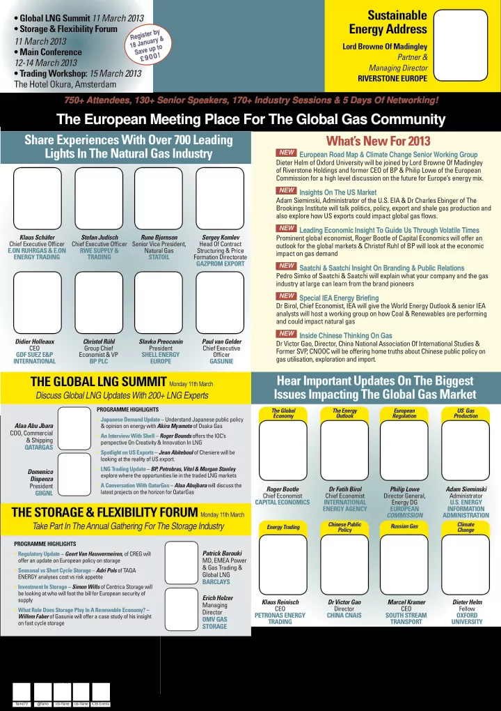 Sustainable • Global LNG Summit 11 March 2013 Energy Address • Storage & Flexibility Forum Register by 18 January & 11 March 2013 Save up to Lord Browne Of Madingley • Main Conference £900! Partner & 12-14 March 2013 Managing Director • Trading Workshop: 15 March 2013 RIVERSTONE EUROPE www.icbi-fl ame.com The Hotel Okura, Amsterdam 750+ Attendees, 130+ Senior Speakers, 170+ Industry Sessions & 5 Days Of Networking! The European Meeting Place For The Global Gas Community Share Experiences With Over 700 Leading What’s New For 2013 Lights In The Natural Gas Industry NEW European Road Map & Climate Change Senior Working Group Dieter Helm of Oxford University will be joined by Lord Browne Of Madingley of Riverstone Holdings and former CEO of BP & Philip Lowe of the European Commission for a high level discussion on the future for Europe’s energy mix. NEW Insights On The US Market Adam Sieminski, Administrator of the U.S. EIA & Dr Charles Ebinger of The Brookings Institute will talk politics, policy, export and shale gas production and also explore how US exports could impact global gas fl ows. NEW Leading Economic Insight To Guide Us Through Volatile Times Klaus Schäfer Stefan Judisch Rune Bjornson Sergey Komlev Prominent global economist, Roger Bootle of Capital Economics will offer an Chief Executive Offi cer Chief Executive Offi cer Senior Vice President, Head Of Contract outlook for the global markets & Christof Ruhl of BP will look at the economic E.ON RUHRGAS & E.ON RWE SUPPLY & Natural Gas Structuring & Price impact on gas demand ENERGY TRADING TRADING STATOIL Formation Directorate GAZPROM EXPORT NEW Saatchi & Saatchi Insight On Branding & Public Relations Pedro Simko of Saatchi & Saatchi will explain what your company and the gas industry at large can learn from the brand pioneers NEW Special IEA Energy Briefi ng Dr Birol, Chief Economist, IEA will give the World Energy Outlook & senior IEA analysts will host a working group on how Coal & Renewables are performing and could impact natural gas NEW Inside Chinese Thinking On Gas Didier Holleaux Christof Rühl Slavko Preocanin Paul van Gelder Dr Victor Gao, Director, China National Association Of International Studies & CEO Group Chief President Chief Executive Former SVP , CNOOC will be offering home truths about Chinese public policy on GDF SUEZ E&P Economist & VP SHELL ENERGY Offi cer gas utilisation, exploration and import. INTERNATIONAL BP PLC EUROPE GASUNIE Hear Important Updates On The Biggest THE GLOBAL LNG SUMMIT Monday 11th March Issues Impacting The Global Gas Market Discuss Global LNG Updates With 200+ LNG Experts PROGRAMME HIGHLIGHTS The Global The Energy European US Gas Economy Outlook Regulation Production • Japanese Demand Update – Understand Japanese public policy Alaa Abu Jbara & opinion on energy with Akira Myamoto of Osaka Gas COO, Commercial • An Interview With Shell – Roger Bounds offers the IOC’s & Shipping perspective On Creativity & Innovation In LNG QATARGAS • Spotlight on US Exports – Jean Abiteboul of Cheniere will be looking at the reality of US export. • LNG Trading Update – BP, Petrobras, Vitol & Morgan Stanley Domenico explore where the opportunities lie in the traded LNG markets Dispenza President • A Conversation With QatarGas – Alaa Abujbara will discuss the Roger Bootle Dr Fatih Birol Philip Lowe Adam Sieminski latest projects on the horizon for QatarGas GIIGNL Chief Economist Chief Economist Director General, Administrator CAPITAL ECONOMICS INTERNATIONAL Energy DG U.S. ENERGY ENERGY AGENCY EUROPEAN INFORMATION THE STORAGE & FLEXIBILITY FORUM Monday 11th March COMMISSION ADMINISTRATION Take Part In The Annual Gathering For The Storage Industry Chinese Public Climate Russian Gas Energy Trading Policy Change PROGRAMME HIGHLIGHTS Patrick Barouki • Regulatory Update – Geert Van Hauwermeiren, of CREG will MD, EMEA Power offer an update on European policy on storage & Gas Trading & • Seasonal vs Short Cycle Storage – Adri Pols of TAQA Global LNG ENERGY analyses cost vs risk appetite BARCLAYS • Investment In Storage – Simon Wills of Centrica Storage will be looking at who will foot the bill for European security of Erich Holzer supply Klaus Reinisch Dr Victor Gao Marcel Kramer Dieter Helm Managing CEO Director CEO Fellow • What Role Does Storage Play In A Renewable Economy? – Director PETRONAS ENERGY CHINA CNAIS SOUTH STREAM OXFORD Willem Faber of Gasunie will offer a case study of his insight OMV GAS TRADING TRANSPORT UNIVERSITY on fast cycle storage STORAGE Created & produced by Co-Sponsors Associate Sponsors Scan with smartphone QR Reader App FOLLOW US ON To Register: Tel: +44 (0)20 7017 7200 Fax: +44 (0)20 7017 7807 Email: info@icbi.co.uk For latest programme or to register, please visit: www.icbi-fl ame.com fl ameTV @ fl ame icbi- fl ame icbi- fl ame ICBI Events