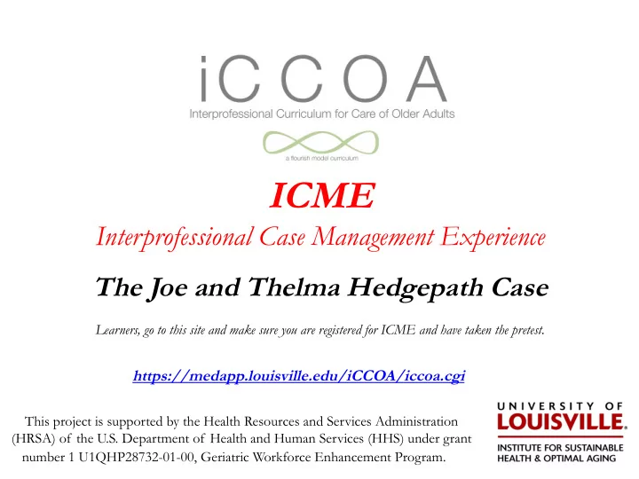 ICME Interprofessional Case Management Experience The Joe and Thelma Hedgepath Case Learners, go to this site and make sure you are registered for ICME and have taken the pretest. https://medapp.louisville.edu/iCCOA/iccoa.cgi This project is supported by the Health Resources and Services Administration (HRSA) of the U.S. Department of Health and Human Services (HHS) under grant number 1 U1QHP28732-01-00, Geriatric Workforce Enhancement Program.