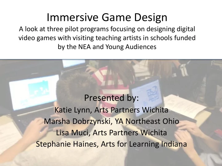 Immersive Game Design A look at three pilot programs focusing on designing digital video games with visiting teaching artists in schools funded by the NEA and Young Audiences Presented by: Katie Lynn, Arts Partners Wichita Marsha Dobrzynski, YA Northeast Ohio Lisa Muci, Arts Partners Wichita Stephanie Haines, Arts for Learning Indiana