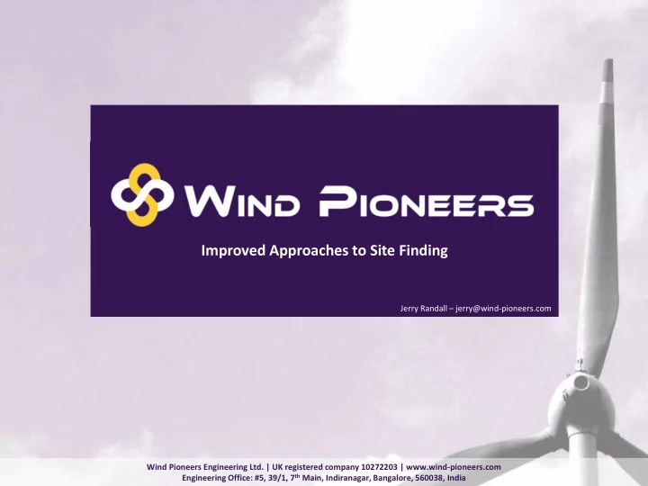 Improved Approaches to Site Finding Jerry Randall – jerry@wind-pioneers.com Wind Pioneers Engineering Ltd. | UK registered company 10272203 | www.wind-pioneers.com Engineering Office: #5, 39/1, 7 th Main, Indiranagar, Bangalore, 560038, India