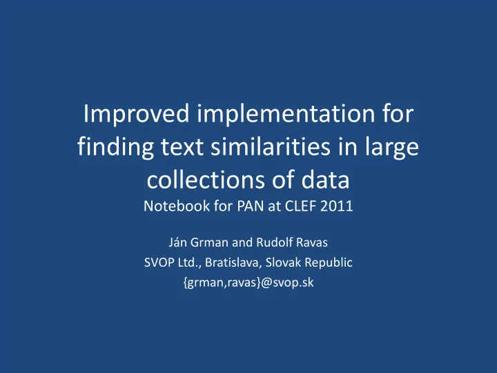 Improved implementation for finding text similarities in large collections of data Notebook for PAN at CLEF 2011 Ján Grman and Rudolf Ravas SVOP Ltd., Bratislava, Slovak Republic {grman,ravas}@svop.sk