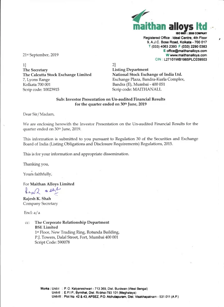 ISO t@l : 2008 COXIPAI{Y Registered Office : ldealCentre,4th Floor , 9, A.J.C. Bose Road, Kolkata - 700 0'17 r (0 3 3)' T :#::e[:iil1,:iff.:.'"'; 21* Septemb er , 2019 W www.maithanalloys.com CIN : 1271 0'1W81985PLC039503 1l 2) The Secretary Listing Department The Calcutta Stock Exchange Limited National Stock Exchange of India Ltd. T,Lyons Range Exchange Plaza, Bandra-Kurla Complex, Kolkata 700 001 Bandra (E), Mumbai - 400 051 Scrip code: 10023915 Scrip code: MAITHANALL Sub: Investor Presentation on Un-audited Financial Results for the quarter ended on 30th ltne,2019 Dear Sir/Madam, We are enclosing herewith the Investor Presentation on the Un-audited Financial Results for the quarter ended on 30*, }une,2019. This information is subrnitted to you pursuant to Regulation 30 of the Securities and Exchange Board of India (Listing Obligations and Disclosure Requirements) Regulations, 2015. This is for your information and appropriate dissemination. Thanking you, Yours faithfully, For Maithan Alloys Limited ,Q ^a!'*' Rajesh K. Shah Company Secretary Encl: af a cc: The Corporate Relationship Department BSE Limited 1't Floor, New Trading Ring, Rotunda Building, P.J. Towers, Dalal Street, Fort, Mumbai 400 001 Script Code: 590078 Works : Unitl . P O Kalyaneshwari - 713 369, Dist. Burdwan (West Bengal) Unit-ll : E.P.l.P, Bymihat, Oist. Ri-bhoi-793 101 (Meghalaya) Unit-lll : Plot No 42 & 43, APSEZ, PO. At$utapuram, Dist. Msakhapatnam - 531 011 (A P)
