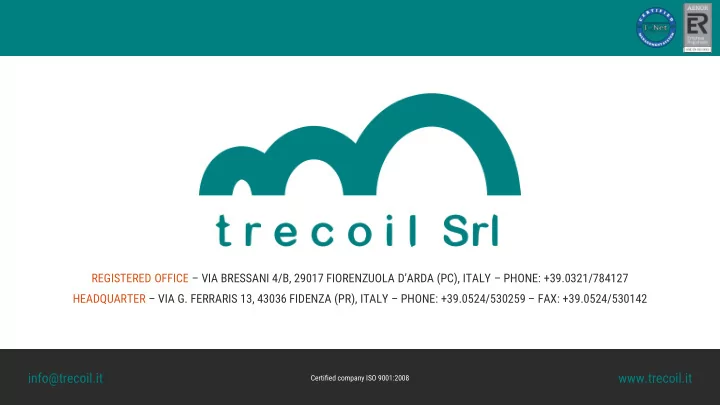 REGISTERED OFFICE – VIA BRESSANI 4/B, 29017 FIORENZUOLA D’ARDA (PC), ITALY – PHONE: +39.0321/784127 HEADQUARTER – VIA G. FERRARIS 13, 43036 FIDENZA (PR), ITALY – PHONE: +39.0524/530259 – FAX: +39.0524/530142 info@trecoil.it www.trecoil.it Certified company ISO 9001:2008