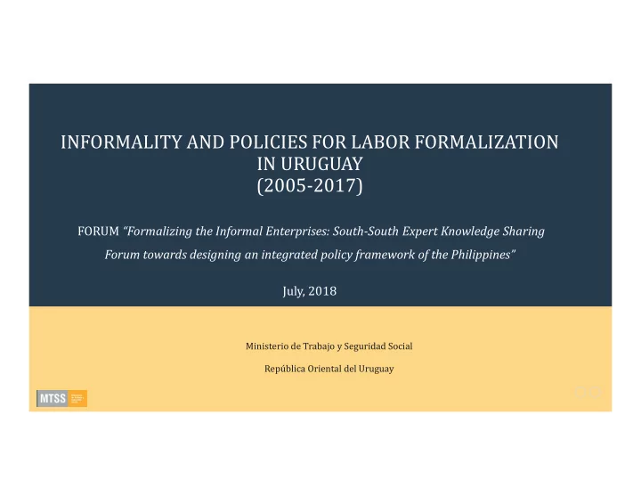 INFORMALITY AND POLICIES FOR LABOR FORMALIZATION IN URUGUAY (2005-2017) FORUM “Formalizing the Informal Enterprises: South-South Expert Knowledge Sharing Forum towards designing an integrated policy framework of the Philippines” July, 2018 Ministerio de Trabajo y Seguridad Social República Oriental del Uruguay