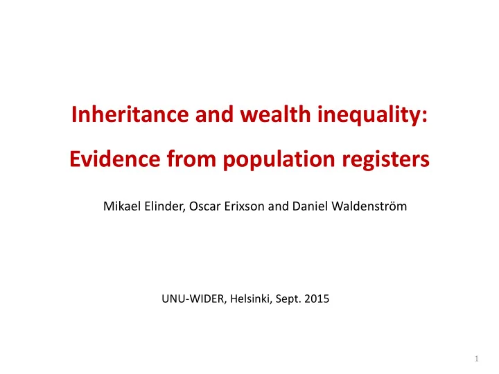 Inheritance and wealth inequality: Evidence from population registers Mikael Elinder, Oscar Erixson and Daniel Waldenström UNU-WIDER, Helsinki, Sept. 2015 1