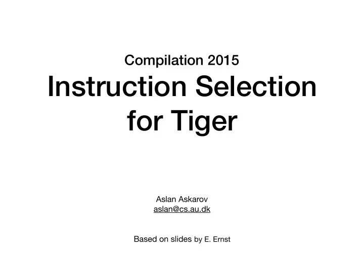 Compilation 2015 Instruction Selection for Tiger Aslan Askarov aslan@cs.au.dk Based on slides by E. Ernst