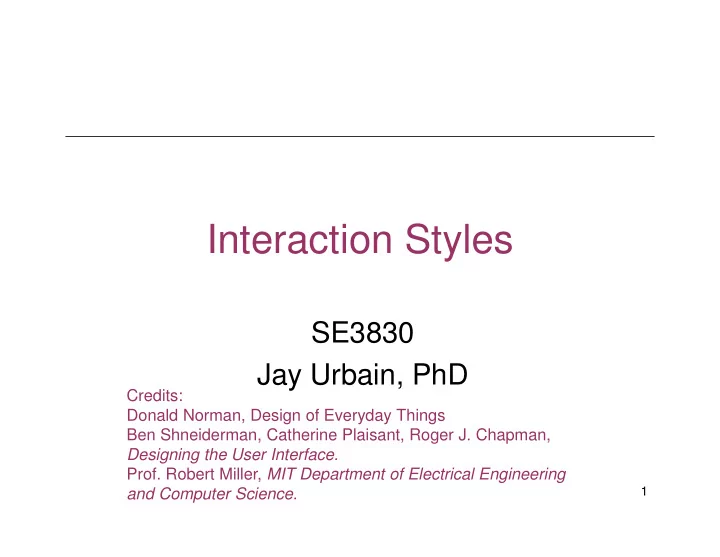 Interaction Styles SE3830 Jay Urbain, PhD Credits: Donald Norman, Design of Everyday Things Ben Shneiderman, Catherine Plaisant, Roger J. Chapman, Designing the User Interface. Prof. Robert Miller, MIT Department of Electrical Engineering 1 and Computer Science.