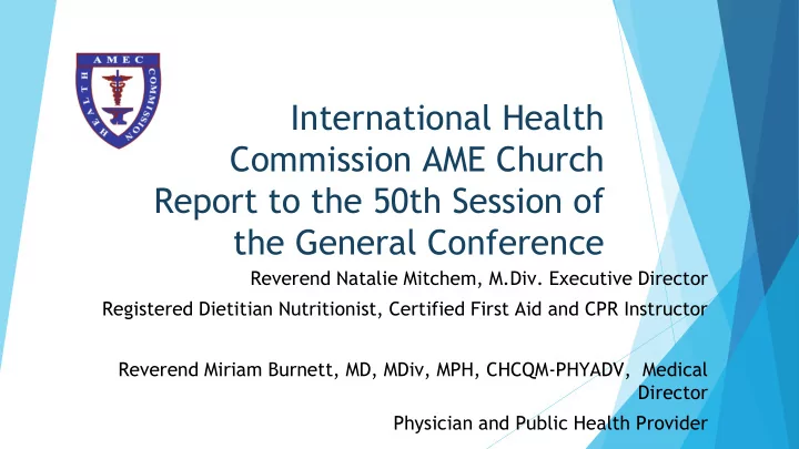 International Health Commission AME Church Report to the 50th Session of the General Conference Reverend Natalie Mitchem, M.Div. Executive Director Registered Dietitian Nutritionist, Certified First Aid and CPR Instructor Reverend Miriam Burnett, MD, MDiv, MPH, CHCQM-PHYADV, Medical Director Physician and Public Health Provider