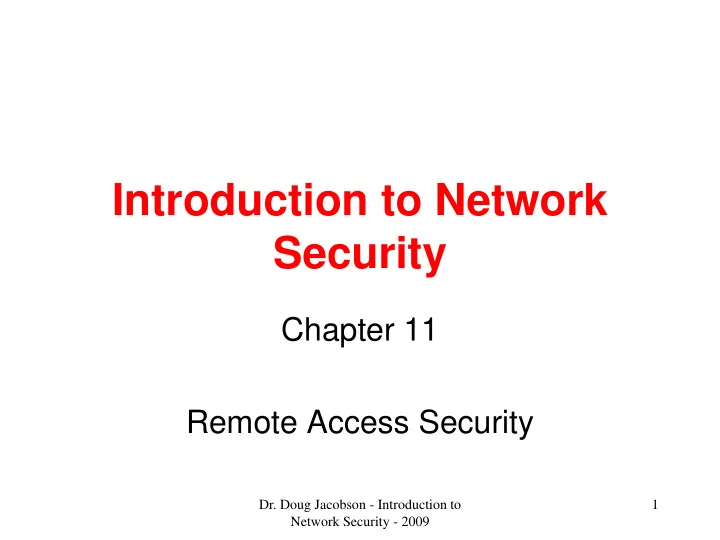 General Remote Access Countermeasures • Encrypted remote access – Application-based – Tunnel-based – SSH – Remote desktop – Secure File transfer Dr. Doug Jacobson - Introduction to 93 Network Security - 2009