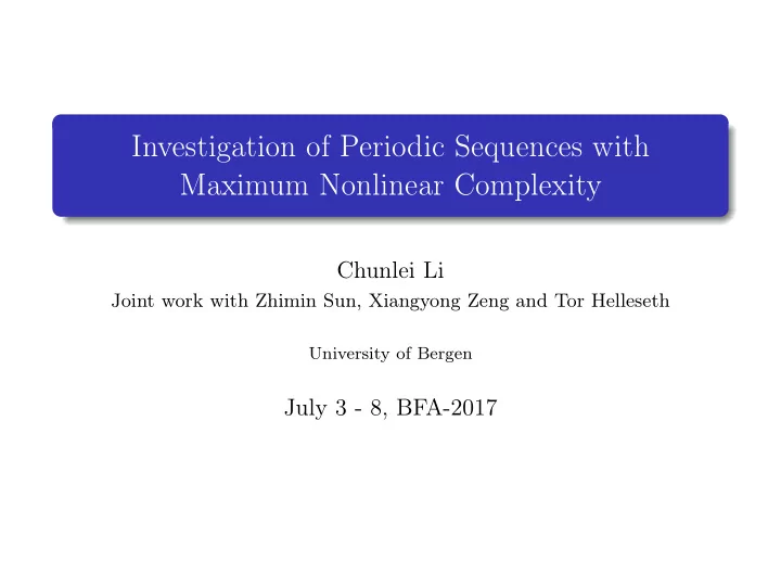 Investigation of Periodic Sequences with Maximum Nonlinear Complexity Chunlei Li Joint work with Zhimin Sun, Xiangyong Zeng and Tor Helleseth University of Bergen July 3 - 8, BFA-2017