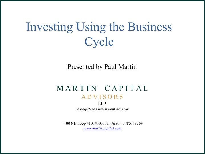 Investing Using the Business Cycle Presented by Paul Martin M A R T I N C A P I T A L A D V I S O R S LLP A Registered Investment Advisor 1100 NE Loop 410, #300, San Antonio, TX 78209 www.martincapital.com