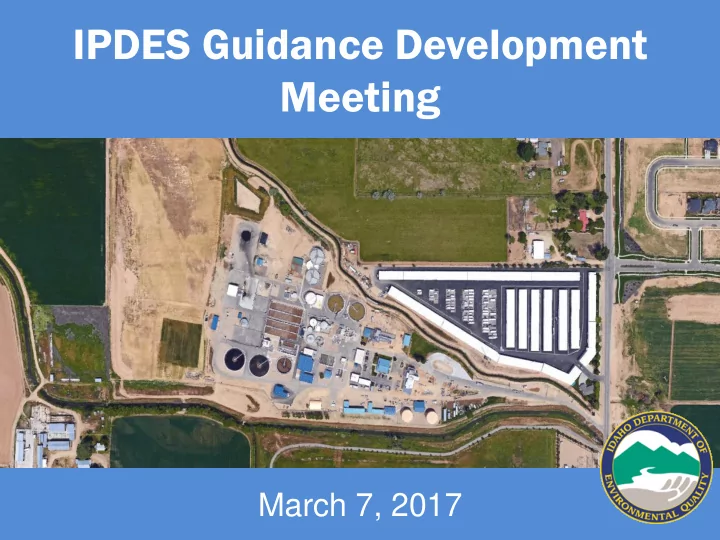 Guidance Schedule • March 14 (COB): ELDG comments due – New section 4.4 – Revised sections 1 – 4.3, appendix A, outline • March 14 (COB): User’s Guide Volume 2 comments Due – New section 1 and outline • March 21 (COB): User’s Guide Volume 1 comments due – Revised sections 9 and 10 – New section 12 • April 26: Next Meeting – ELDG – User’s Guide Volume 2— Sector-Specific (POTWs) • Comments to: IPDESGuidance@deq.idaho.gov