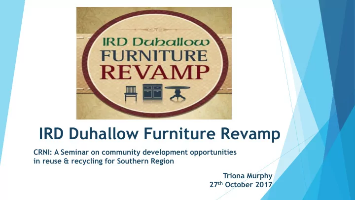 IRD Duhallow Furniture Revamp CRNI: A Seminar on community development opportunities in reuse & recycling for Southern Region Triona Murphy 27 th October 2017