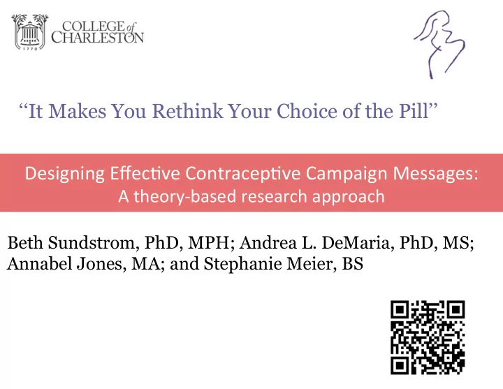 ‘‘It Makes You Rethink Your Choice of the Pill’’ Designing ¡Effec+ve ¡Contracep+ve ¡Campaign ¡Messages: ¡ ¡ A ¡theory-‑based ¡research ¡approach Beth Sundstrom, PhD, MPH; Andrea L. DeMaria, PhD, MS; Annabel Jones, MA; and Stephanie Meier, BS