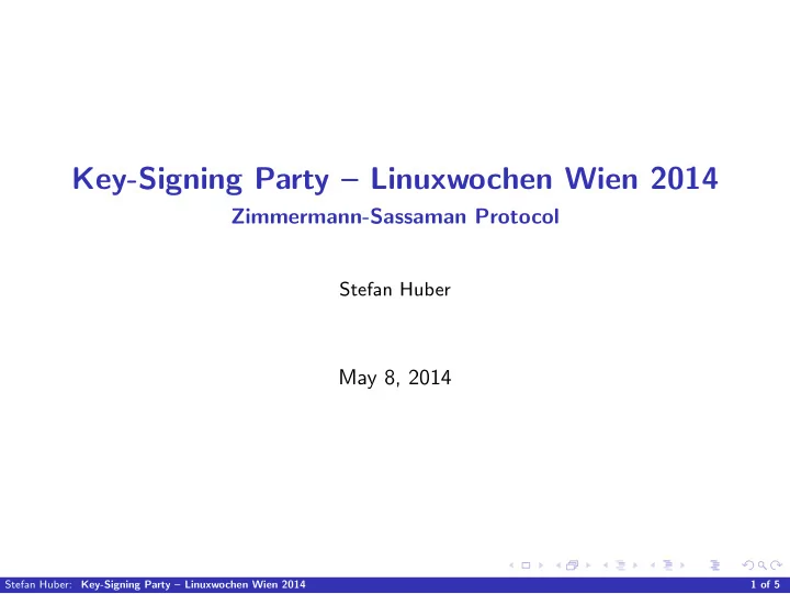 Key-Signing Party – Linuxwochen Wien 2014 Zimmermann-Sassaman Protocol Stefan Huber May 8, 2014 Stefan Huber: Key-Signing Party – Linuxwochen Wien 2014 1 of 5