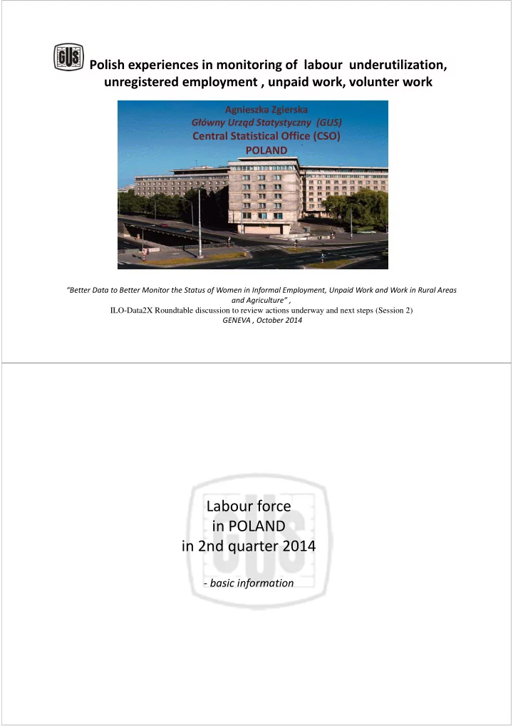 Polish experiences in monitoring of labour underutilization, unregistered employment , unpaid work, volunter work Agnieszka Zgierska G ł ówny Urz ą d Statystyczny (GUS) Central Statistical Office (CSO) POLAND “Better Data to Better Monitor the Status of Women in Informal Employment, Unpaid Work and Work in Rural Areas and Agriculture” , ILO-Data2X Roundtable discussion to review actions underway and next steps (Session 2) GENEVA , October 2014 Labour force in POLAND in 2nd quarter 2014 ‐ basic information