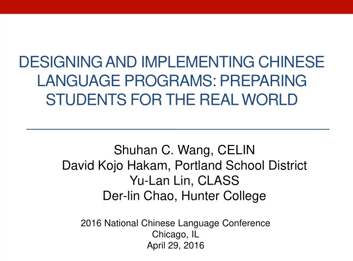 DESIGNING AND IMPLEMENTING CHINESE LANGUAGE PROGRAMS: PREPARING STUDENTS FOR THE REAL WORLD Shuhan C. Wang, CELIN David Kojo Hakam, Portland School District Yu-Lan Lin, CLASS Der-lin Chao, Hunter College 2016 National Chinese Language Conference Chicago, IL April 29, 2016