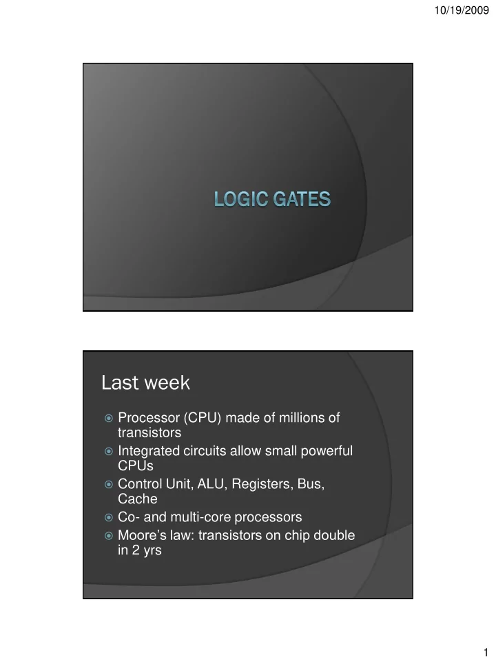 10/19/2009 Last week Processor (CPU) made of millions of transistors Integrated circuits allow small powerful CPUs Control Unit, ALU, Registers, Bus, Cache Co- and multi-core processors Moore’s law: transistors on chip double in 2 yrs 1