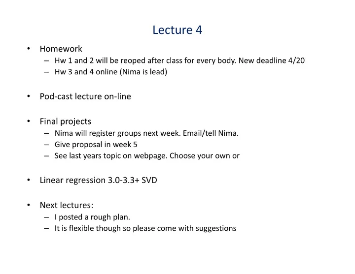 Lecture 4 Homework • – Hw 1 and 2 will be reoped after class for every body. New deadline 4/20 – Hw 3 and 4 online (Nima is lead) Pod-cast lecture on-line • Final projects • – Nima will register groups next week. Email/tell Nima. – Give proposal in week 5 – See last years topic on webpage. Choose your own or Linear regression 3.0-3.3+ SVD • Next lectures: • – I posted a rough plan. – It is flexible though so please come with suggestions