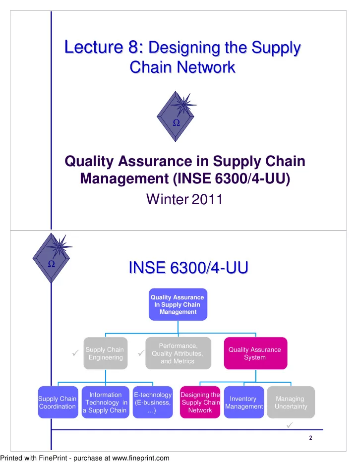 Lecture 8: Designing the Supply Lecture 8: Designing the Supply Chain Network Chain Network Ω Quality Assurance in Supply Chain Management (INSE 6300/4-UU) Winter 2011 Ω INSE 6300/4- -UU UU INSE 6300/4 Quality Assurance In Supply Chain Management Performance, Supply Chain Quality Assurance � � Quality Attributes, Engineering System and Metrics Information E-technology Designing the Supply Chain Inventory Managing Technology in (E-business, Supply Chain Coordination Management Uncertainty a Supply Chain …) Network � � Printed with FinePrint - purchase at www.fineprint.com