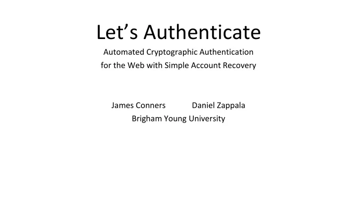 Let’s Authenticate Automated Cryptographic Authentication for the Web with Simple Account Recovery James Conners Daniel Zappala Brigham Young University