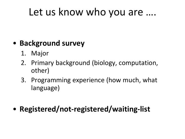 Let us know who you are …. • Background survey 1. Major 2. Primary background (biology, computation, other) 3. Programming experience (how much, what language) • Registered/not-registered/waiting-list