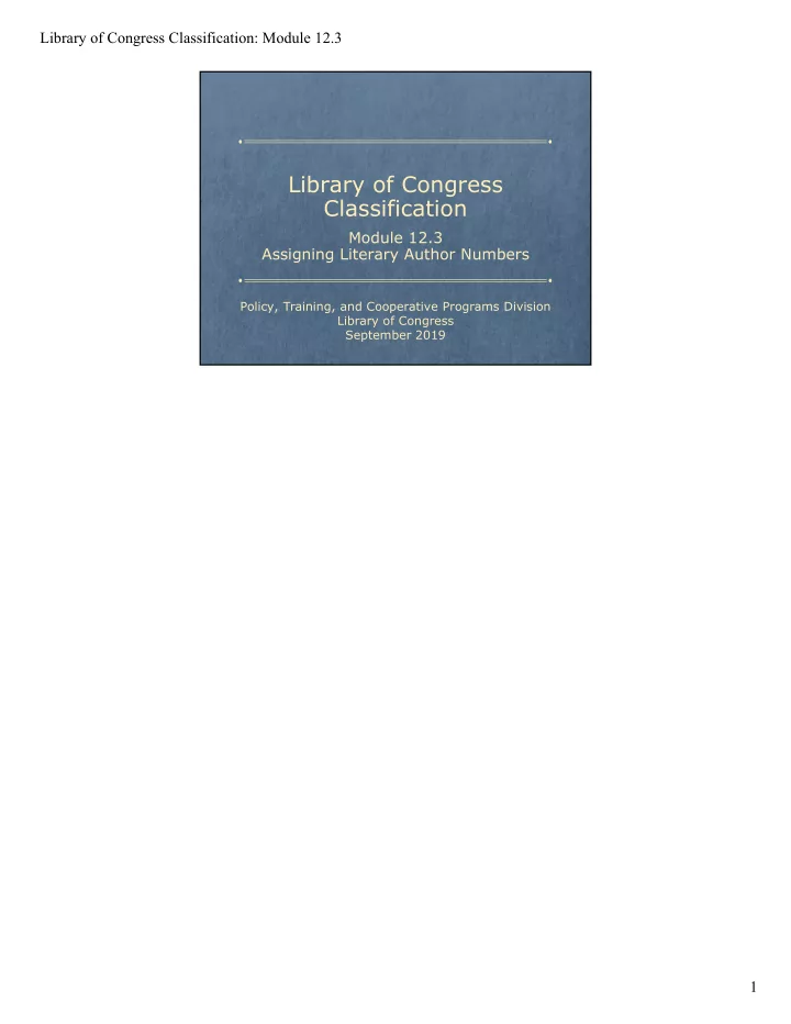 Library of Congress Classification: Module 12.3 Library of Congress Classification Module 12.3 Assigning Literary Author Numbers Policy, Training, and Cooperative Programs Division Library of Congress September 2019 1