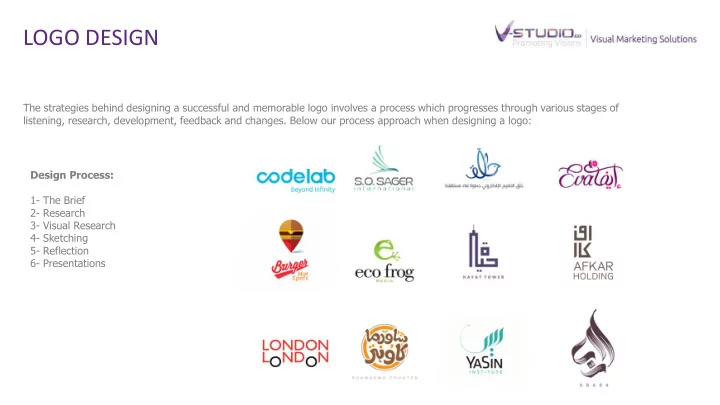 LOGO DESIGN The strategies behind designing a successful and memorable logo involves a process which progresses through various stages of listening, research, development, feedback and changes. Below our process approach when designing a logo: Design Process: 1- The Brief 2- Research 3- Visual Research 4- Sketching 5- Reflection 6- Presentations