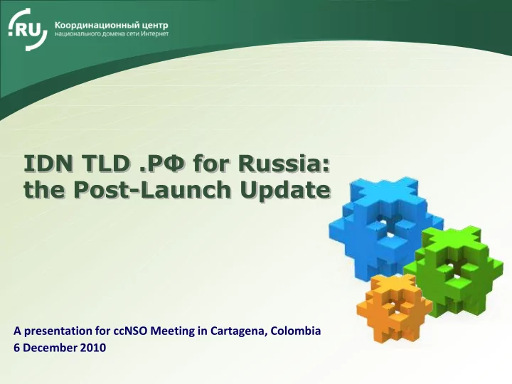 LOGO IDN TLD .РФ for Russia: the Post-Launch Update A presentation for ccNSO Meeting in Cartagena, Colombia 6 December 2010