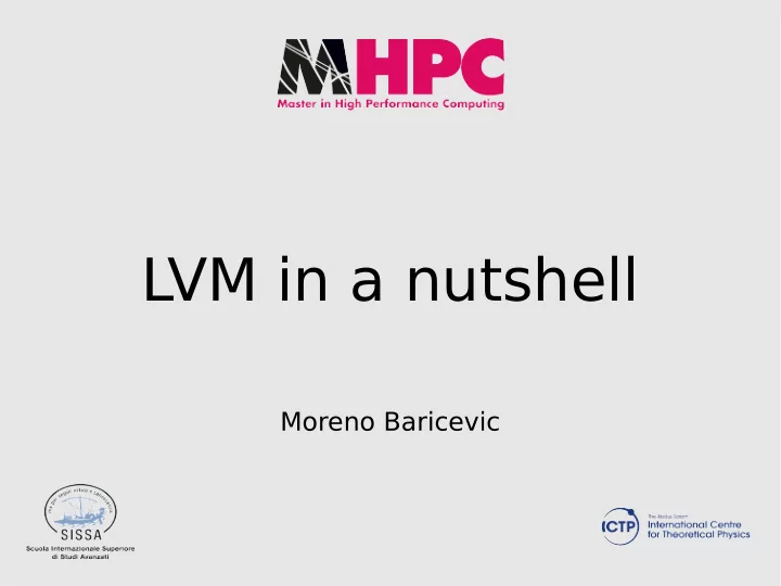 What is LVM? Logical Volume Manager a logical layer placed between disk partitions and file systems ● breaks filesystem / physical partition binding ● provides logical partitions called volumes ● greater flexibility (live create / remove / resize) ● allows disks aggregation (MD compatible) ● live snapshots ( copy-on-write ) and cloning (mirror) ● Cons? Additional layers of complexity. disaster recovery becomes more difficult ● another abstraction layer in I/O operations ● advanced skills required ●