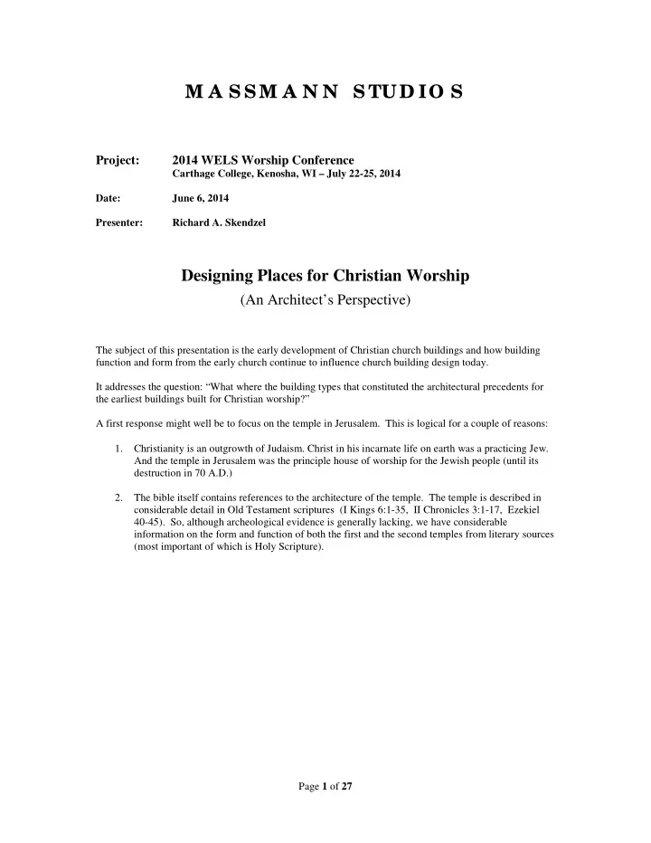M A S S M A N N S TUD IO S Project: 2014 WELS Worship Conference Carthage College, Kenosha, WI – July 22-25, 2014 Date: June 6, 2014 Presenter: Richard A. Skendzel Designing Places for Christian Worship (An Architect’s Perspective) The subject of this presentation is the early development of Christian church buildings and how building function and form from the early church continue to influence church building design today. It addresses the question: “What where the building types that constituted the architectural precedents for the earliest buildings built for Christian worship?” A first response might well be to focus on the temple in Jerusalem. This is logical for a couple of reasons: 1. Christianity is an outgrowth of Judaism. Christ in his incarnate life on earth was a practicing Jew. And the temple in Jerusalem was the principle house of worship for the Jewish people (until its destruction in 70 A.D.) 2. The bible itself contains references to the architecture of the temple. The temple is described in considerable detail in Old Testament scriptures (I Kings 6:1-35, II Chronicles 3:1-17, Ezekiel 40-45). So, although archeological evidence is generally lacking, we have considerable information on the form and function of both the first and the second temples from literary sources (most important of which is Holy Scripture). Page 1 of 27