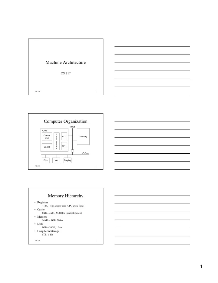 Machine�Architecture CS�217 Fall�2001 1 Computer�Organization MBus CPU R Control e ALU Memory g Unit i s t e r FPU Cache s I/O�Bus Disk Net Display Fall�2001 2 Memory�Hierarchy • Registers ~128,�1-5ns�access�time�(CPU�cycle�time) • Cache 1KB�– 4MB,�20-100ns�(multiple�levels) • Memory 64MB�– 1GB,�200ns • Disk 1GB�– 20GB,�10ms • Long-term�Storage 1TB,�1-10s Fall�2001 3 1