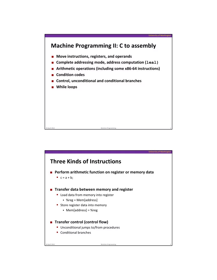 University of Washington Machine Programming II: C to assembly � Move instructions, registers, and operands � Complete addressing mode, address computation ( leal) � Arithmetic operations (including some x86 ‐ 64 instructions) � Condition codes � Control, unconditional and conditional branches � While loops 09 April 2012 Machine Programming 1 University of Washington Three Kinds of Instructions � Perform arithmetic function on register or memory data � c = a + b; � Transfer data between memory and register � Load data from memory into register � %reg = Mem[address] � Store register data into memory � Mem[address] = %reg � Transfer control (control flow) � Unconditional jumps to/from procedures � Conditional branches 09 April 2012 Machine Programming 2