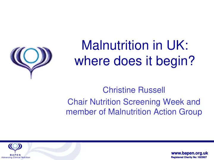 Malnutrition in UK: where does it begin? Christine Russell Chair Nutrition Screening Week and member of Malnutrition Action Group www.bapen.org.uk www.bapen.org.uk Registered Charity No: 1023927 Registered Charity No: 1023927