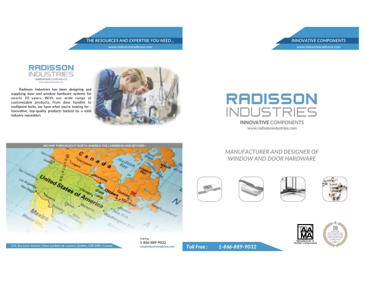 THE RESOURCES AND EXPERTISE YOU NEED… INNOVATIVE COMPONENTS www.industriesradisson.com www.industriesradisson.com Radisson Industries has been designing and supplying door and window hardware systems for nearly 20 years. With our wide range of customizable products, from door handles to mulDpoint locks, we have what you’re looking for - innovaDve, top-quality products backed by a solid industry reputaDon. WE SHIP THROUGHOUT NORTH AMERICA THE CARIBBEAN AND BEYOND ! MANUFACTURER AND DESIGNER OF WINDOW AND DOOR HARDWARE Toll Free : 1-866-889-9032 136, Rue Léon-Vachon | Saint-Lambert-de-Lauzon | Québec, G0S 2W0 | Canada Toll Free : 1-866-889-9032 info@industriesradisson.com
