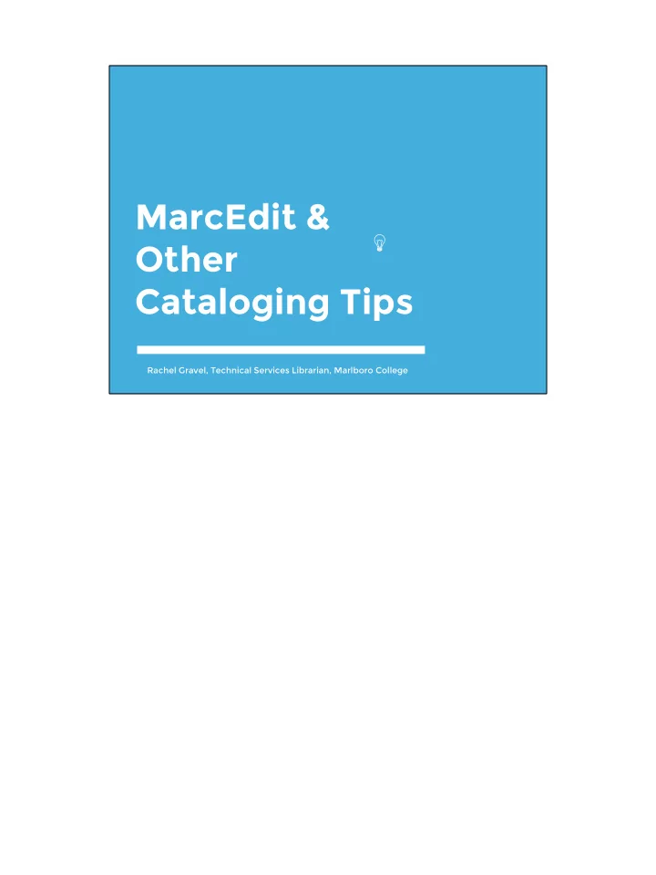 MarcEdit & Other Cataloging Tips Rachel Gravel, Technical Services Librarian, Marlboro College