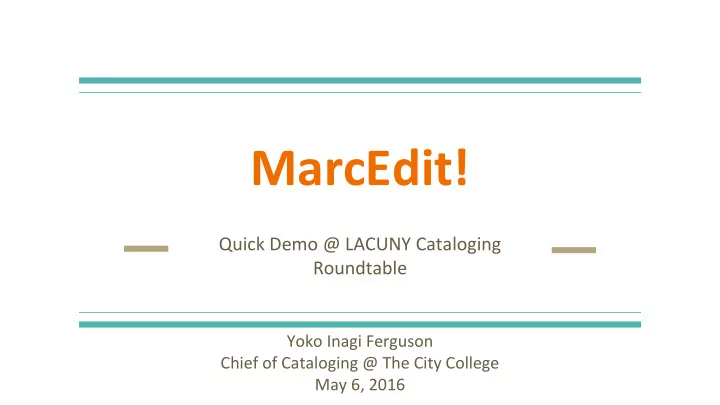 MarcEdit! Quick Demo @ LACUNY Cataloging Roundtable Yoko Inagi Ferguson Chief of Cataloging @ The City College May 6, 2016