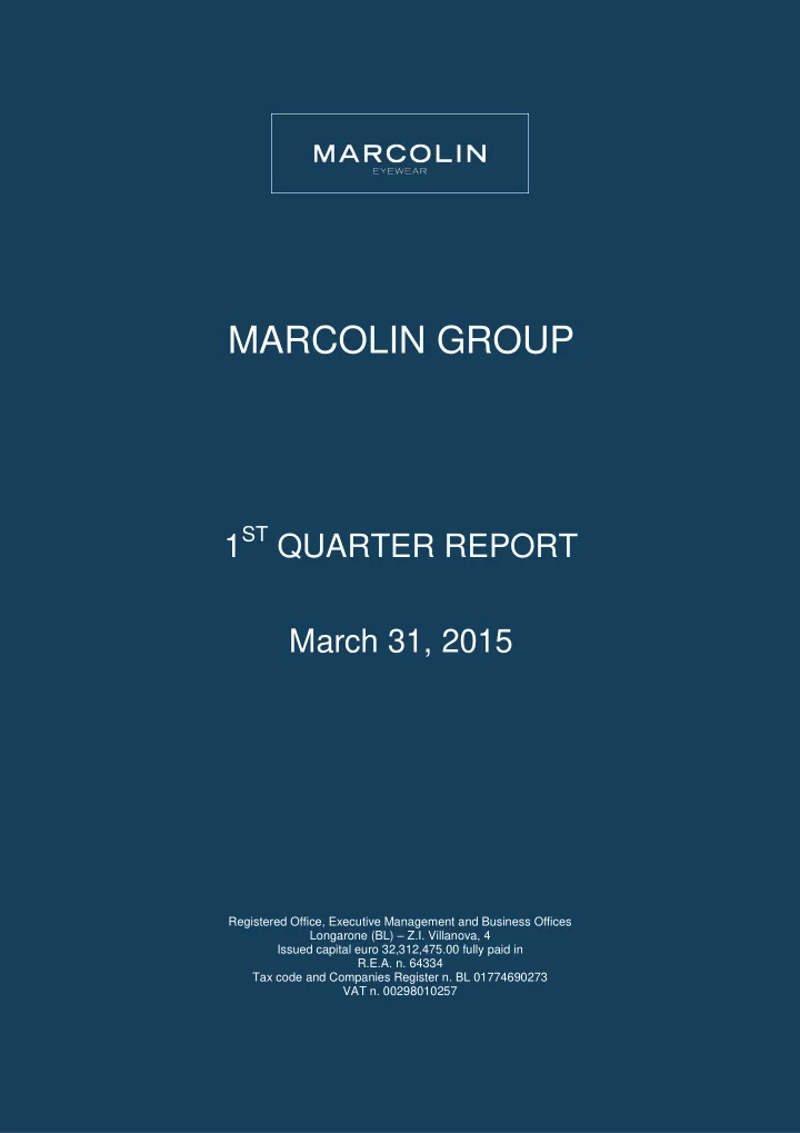 Marcolin Group MARCOLIN GROUP 1 ST QUARTER REPORT March 31, 2015 Registered Office, Executive Management and Business Offices Longarone (BL) – Z.I. Villanova, 4 Issued capital euro 32,312,475.00 fully paid in R.E.A. n. 64334 Tax code and Companies Register n. BL 01774690273 VAT n. 00298010257 1