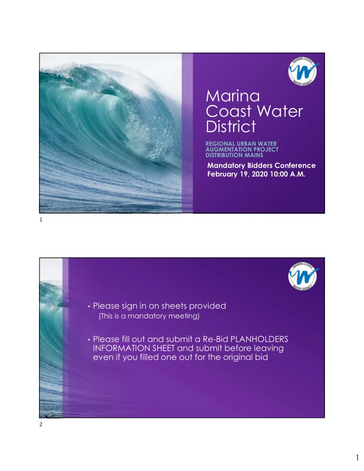 Marina Coast Water District REGIONAL URBAN WATER AUGMENTATION PROJECT DISTRIBUTION MAINS Mandatory Bidders Conference February 19, 2020 10:00 A.M. 1 • Please sign in on sheets provided (This is a mandatory meeting) • Please fill out and submit a Re-Bid PLANHOLDERS INFORMATION SHEET and submit before leaving even if you filled one out for the original bid 2 1